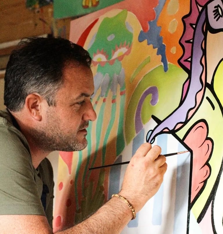Il privilégie l'instinct et l'urgence, créant une peinture brute et spontanée qui rappelle l'énergie de Basquiat ou Combas.