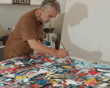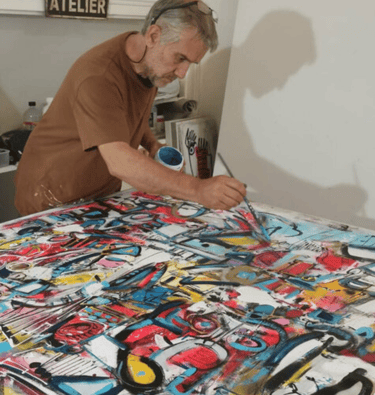 Inspiré par l'expressionnisme abstrait et le street art, il crée des œuvres dynamiques explorant l'équilibre entre formes et couleurs. Travaillant à l'acrylique sur toile, il incorpore collages et techniques mixtes pour enrichir ses textures.